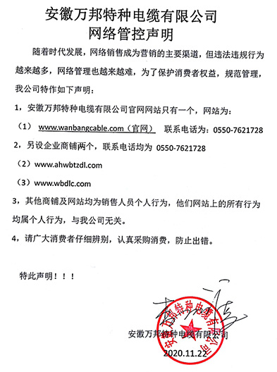 鄭重聲明:安徽萬邦特種電纜有限公司官方網站為:www_wanbangcable_com.1ywb.com,除此之外無任何子網站或合作網站,其余均為假冒偽劣。電話:0550-7621728 13485756353 地 址:安徽省天長市滁州高新技術產業開發區經四路29號